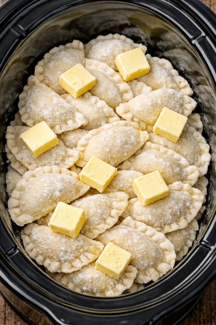 2. First Layer of Pierogi: Arrange half of the frozen pierogi in an even layer at the bottom of your slow cooker. Don’t worry if they overlap a little; they’ll settle as they cook.
