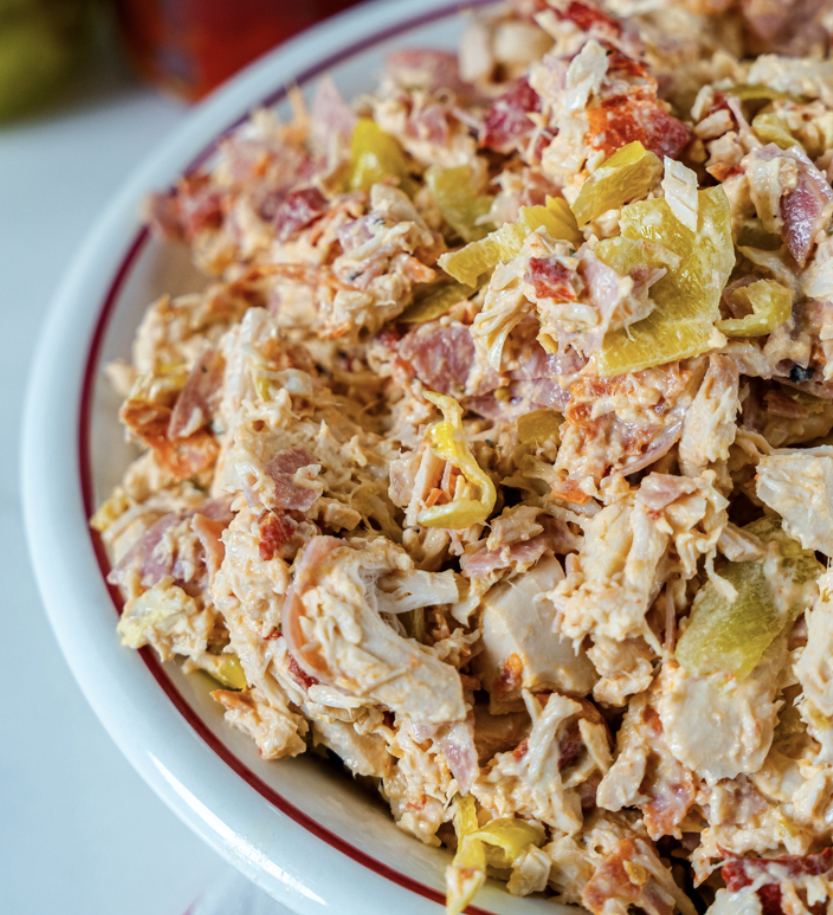 In a large mixing bowl, add the shredded chicken, chopped salami, roasted red peppers, and pepperoncini.