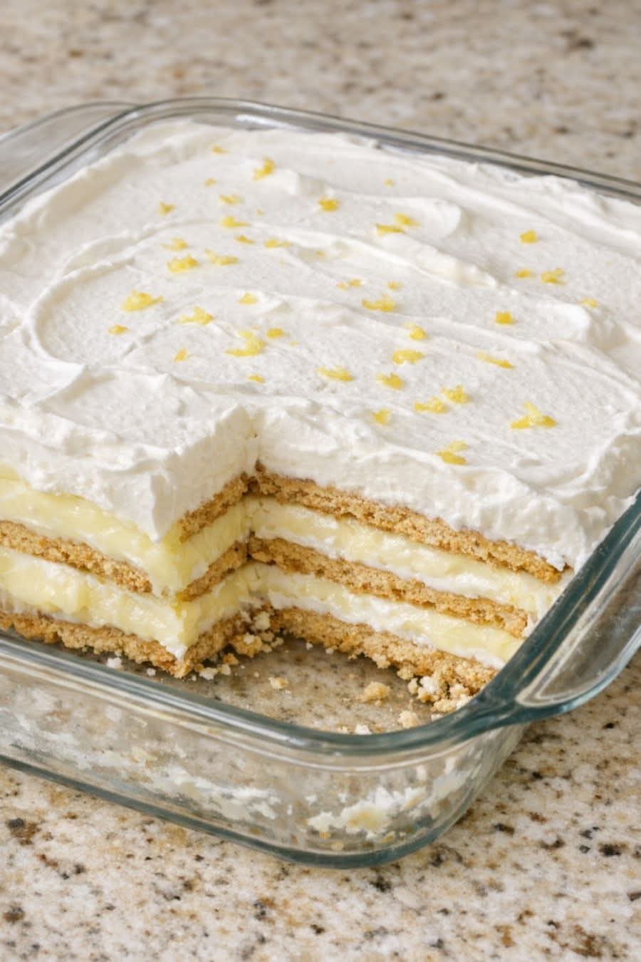 Often called a “no-bake lemon icebox cake,” this dessert has been a beloved favorite for generations. It’s the kind of recipe passed down in family notebooks, brought to church potlucks, and made on warm afternoons when turning on the oven feels like too much work. With just a handful of pantry staples—graham crackers, instant lemon pudding, milk, and fluffy whipped topping—you can create a dessert that tastes like it took hours to prepare.