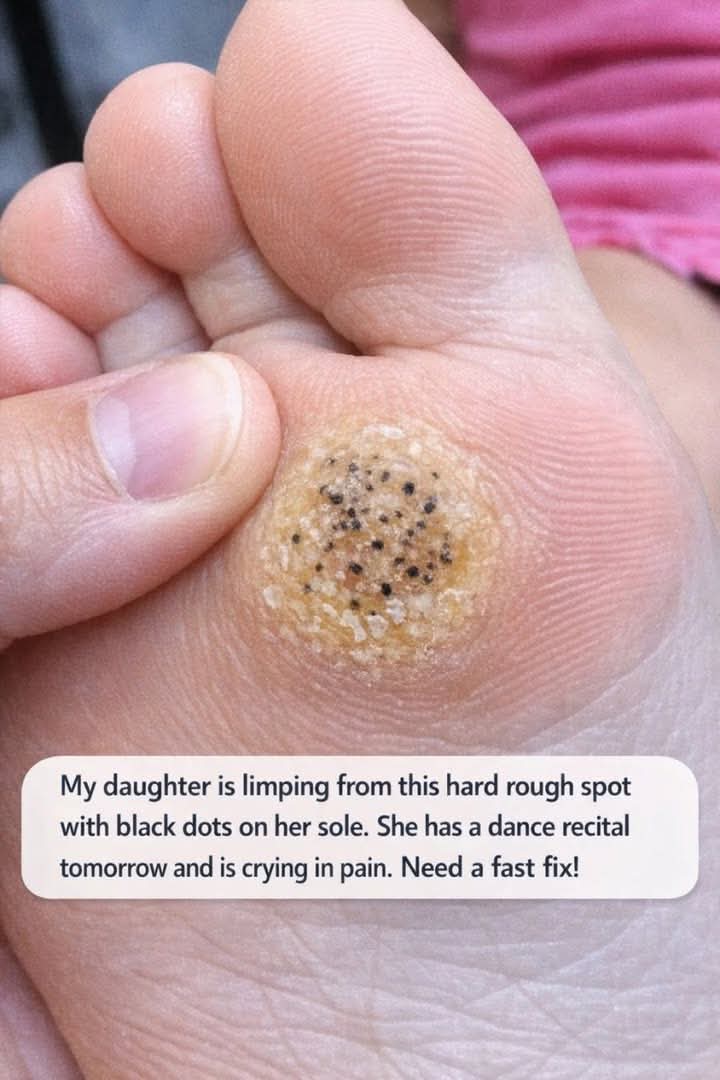 My daughter is limping from this hard rough spot with black dots on her sole. She has a dance recital tomorrow and is crying in pain. Need a fast fix!
