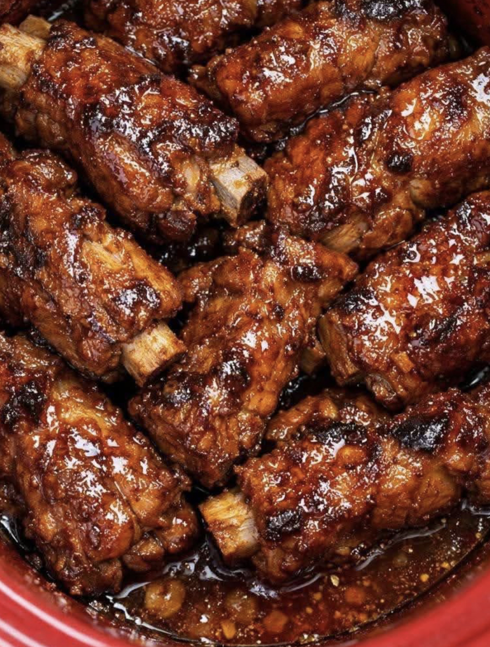 Serve the ribs hot, spooning more of the rich amber sauce from the slow cooker over each portion. The meat should be fall-off-the-bone tender, with glistening caramelized edges and plenty of sauce pooling on the plate.
